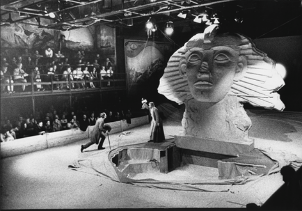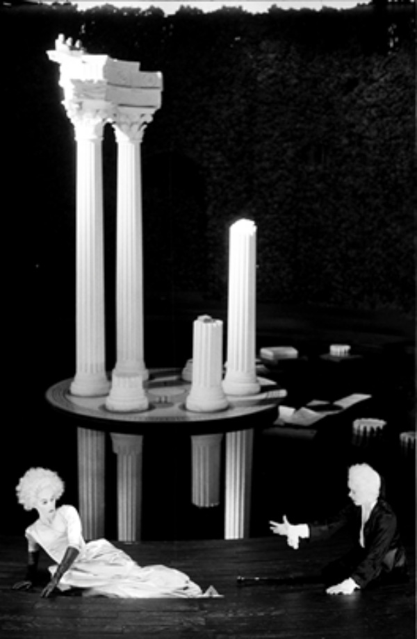 Das optische Verfahren der Doppelbelichtung ist für diese Ausstellung in einem übertragenen Sinn wegweisend, wenn die bis heute unverdrossen aktive Künstlerin mit ihren Werken zugleich den Fokus auf langjährige Weggefährt:innen richtet. „Doppelbelichtung“ ist Nachklang und Hommage zugleich: IhreBilder sind zu sehen im Dialog mit Aufnahmen ihrer Kollegin und Freundin Abisag Tüllmann (1935-1996) und zeigen legendäre Arbeiten der Kostümbildnerin Moidele Bickel (1937-2016) und des Bühnenbildners Karl-Ernst Herrmann (1936-2018), dessen Nachlass seit 2023 im Deutschen Theatermuseum bewahrt wird.