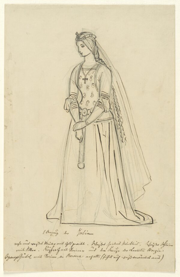 Kostümentwurf für "Julia" zu "Romeo und Julia" am Herzoglichen Hoftheater Meiningen, von Georg II. von Meiningen, entstanden 1897. Deutsches Theatermuseum München, Inv. Nr. II1242, ID 313321.