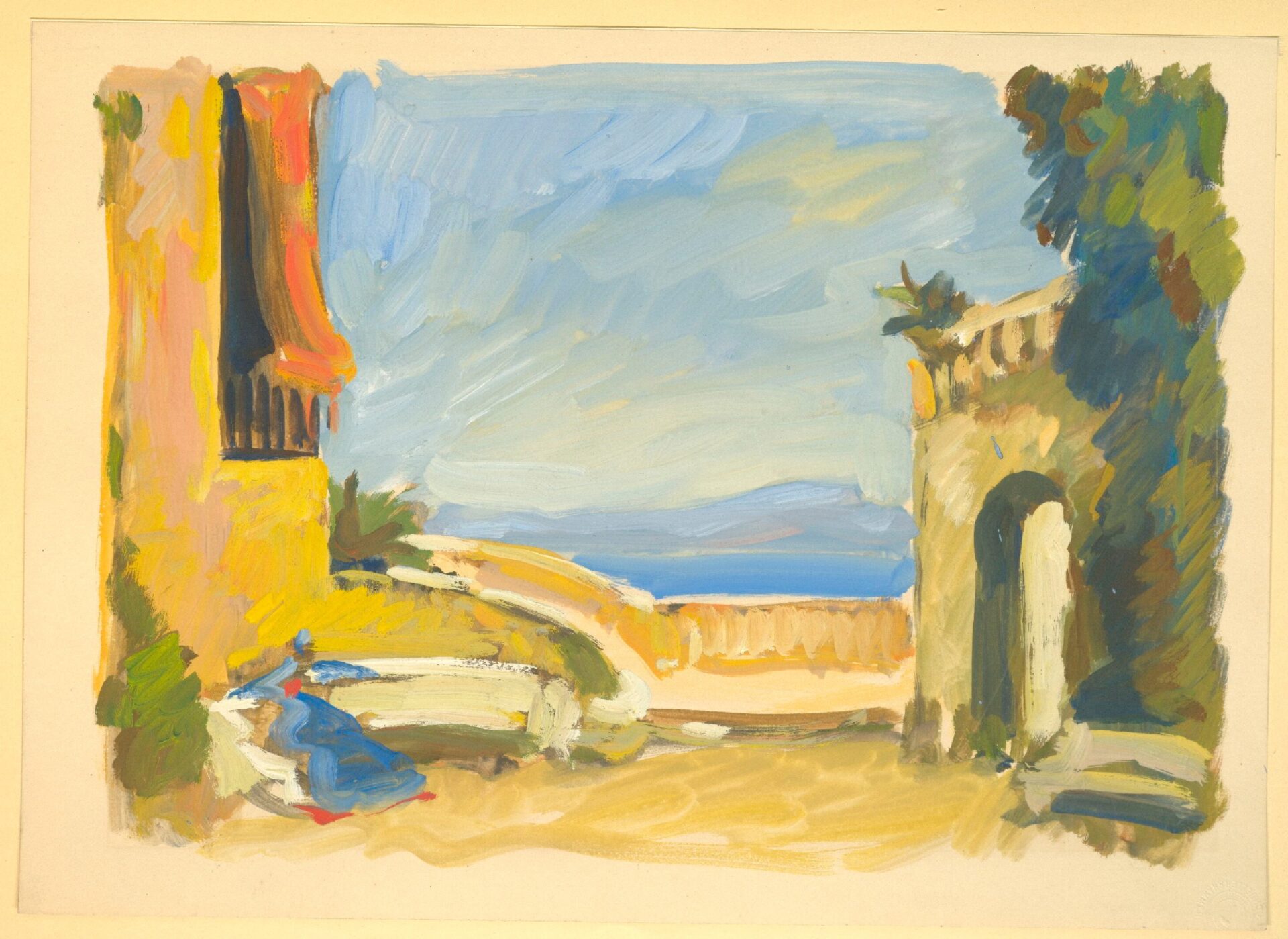 Der Bühnenbildentwurf von Leo Pasetti zeigt eine südländische Villa mit einer roten Markise vor einem Meerespanorama. Auf der rechten Seite ist eine Gartenanlage angedeutet, in der Agaven und Bäume wachsen. Auf beiden Seiten laden Steinbänke zum Verweilen ein – auf der linken Bank hat eine in ein blaues Gewand gehüllte Figur Platz genommen.