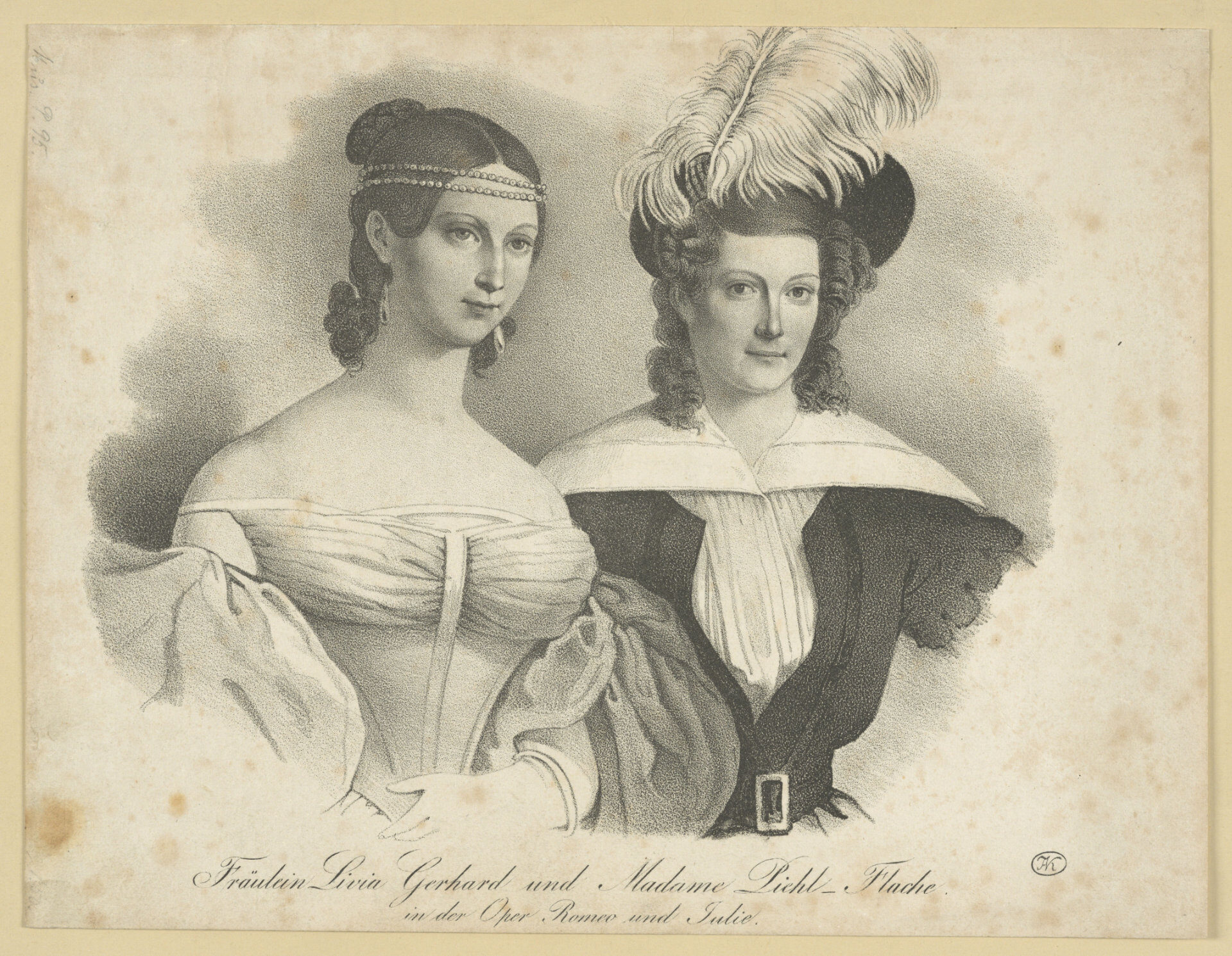 Diese Lithographie zeigt Wilhelmine Piehl-Flache (1812–1838) als Romeo und Livia Gerhardt (1818–1891) als Julie in einer Aufführung von Vincenzo Bellinis „Romeo und Julie“ („I Capuleti e i Montecchi“) am Königsstädtischen Theater in Berlin, um 1835. Die Oper verarbeitet als Vorlage Matteo Bandellos Novelle „La sfortunata morte di due infelicissimi amanti“ („Der tragische Tod zweier unglücklich Liebender“), die auch Shakespeare für sein Drama heranzog. In seiner tragedia lirica legt Bellini die Rolle des Romeo als Hosenrolle für eine Mezzosopranistin an – ursprünglich dachte der Komponist dabei an Giuditta Grisi, die die Partie zuerst mit Amalie Schütz 1930 in Mailand sang. Auch in der deutschen Inszenierung wurden beide Hauptrollen von sehr jungen Frauen gesungen. Das Brustbild zeigt Julie in hellem Miederkleid mit Ballonärmeln und einer Perlenkette als Haarschmuck. Romeo trägt ein tailliertes Wams über weißem Hemd und ein Federbarrett – ein eindrucksvolles Beispiel für romantische Opernästhetik und die geschlechterspezifische Rollendarstellung.