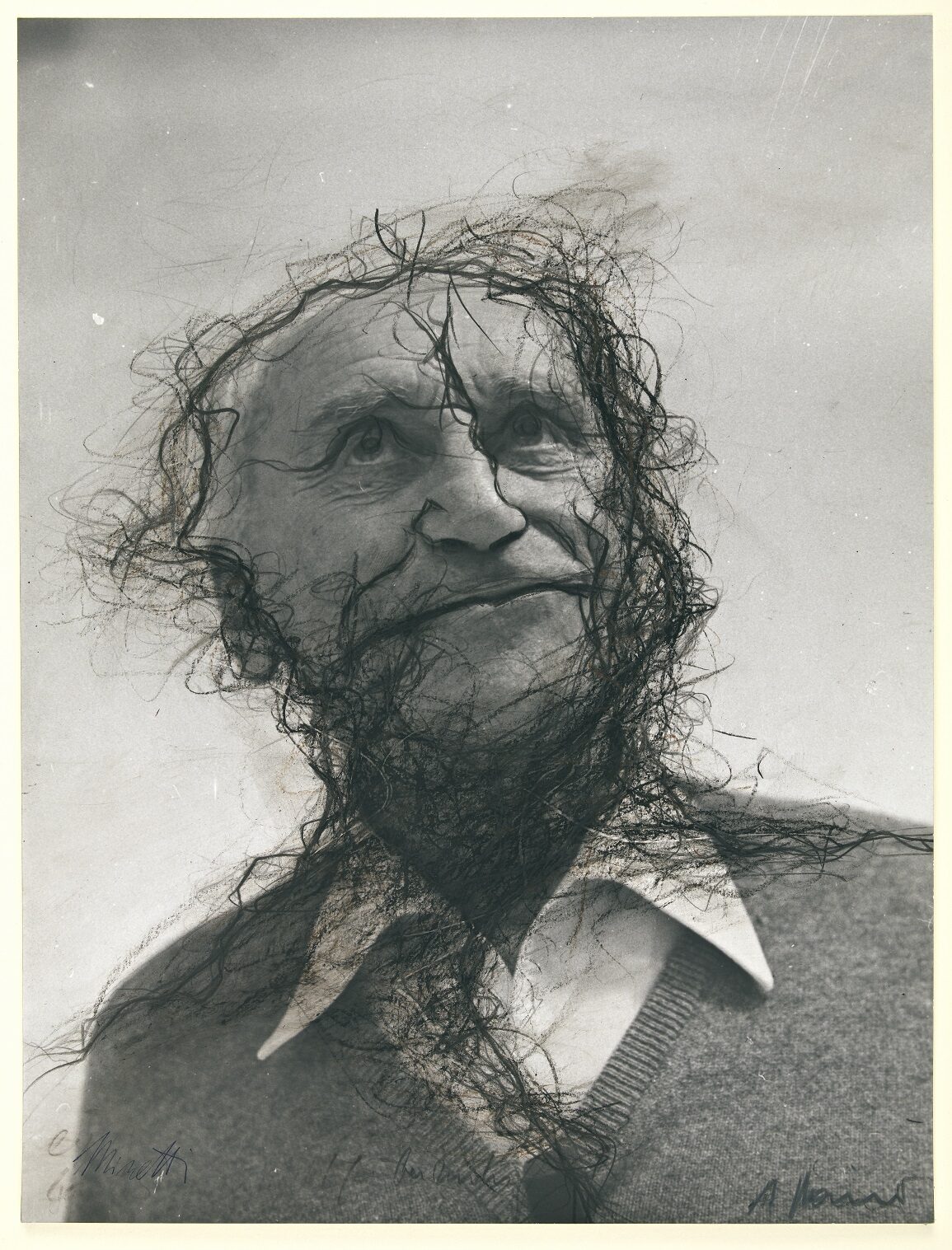Die Überzeichnung, die Arnulf Rainer am Fotoportrait der Herlinde Kölbl dem Schauspieler Bernhard Minetti mit Ölkreide anlegt, ist ein fabelhaftes Beispiel dafür, wie mittels zeitgenössischer Mischtechnik das klassische Portrait eines Schauspielers mit Aussage und Bedeutung aufgeladen wird.