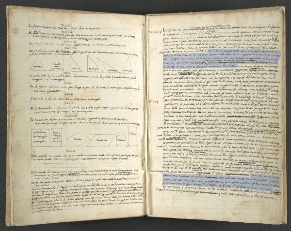 Die um 1620 datierte Handschrift mit dem Titel „Regole generali di prospetiva“ („Allgemeine Regeln der Perspektive“) wurde von Giovanni Battista Aleotti, detto l‘Argenta (1546–1636), einem bedeutenden Ingenieur sowie Theater- und Bühnenarchitekten, niedergeschrieben. Aleotti verfasste dieses Werk in fortgeschrittenem Alter und hinterließ damit eine Art Anleitung zum perspektivischen Zeichnen – insbesondere für die Gestaltung von Bühnenbildern.