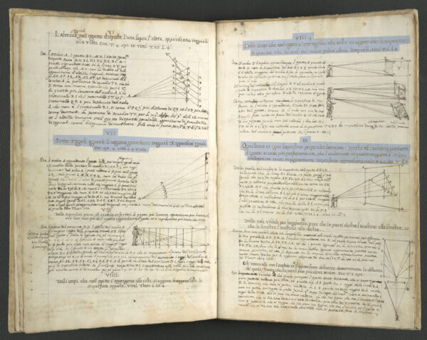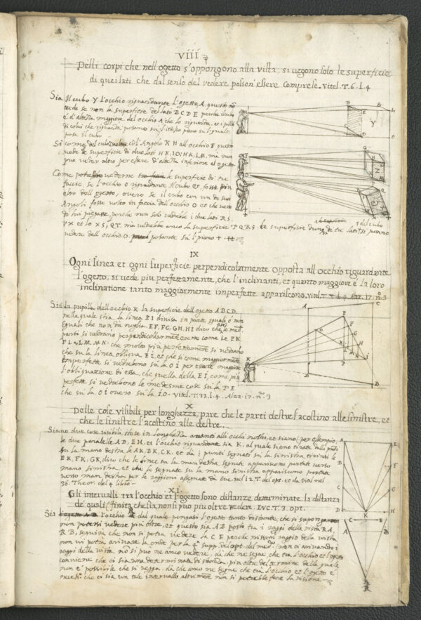 In seinem bislang unveröffentlichten, handschriftlichen Traktat unterstreicht Giovanni Battista Aleotti die grundlegende Bedeutung der perspektivischen Zeichnung für jede künstlerische Gestaltung. Er beruft sich dabei auf klassische Autoritäten wie Euklid, Heliodoros, Vitello und Alhazen, deren Erkenntnisse zu Geometrie, Perspektive und Optik er aufgreift. Besonderes Augenmerk legt Aleotti auf die Verbindung von Perspektive und Bühnenbild. Dabei bezieht er sich auf Vitruvs Begriff der Scenographia (Buch I, Kapitel II der Zehn Bücher über Architektur) und übernimmt Illustrationen aus theoretischen Werken, die sich in seiner Bibliothek fanden – darunter Piero della Francescas „De prospectiva pingendi“ und Vignolas „Le due regole della prospettiva“ (1583). Auch ohne Sebastiano Serlio namentlich zu nennen, reflektiert Aleotti die zeitgenössische Begriffslage und konzentriert sich schließlich auf die optischen Vorgänge des Sehens – insbesondere darauf, wie Dinge dem Auge erscheinen und welche Wirkung sie auf den Betrachter entfalten.
