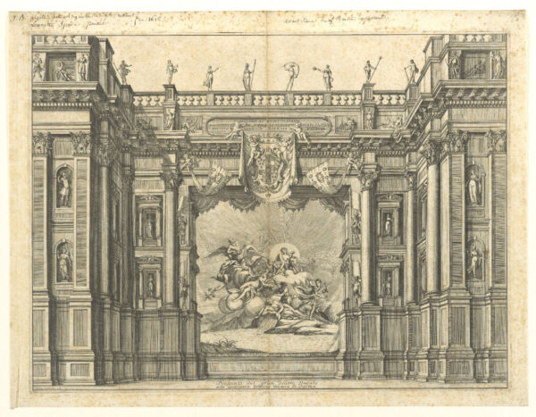 Wiedergabe eines Bühnenbilds zu der Oper "Servio Tullio" am Salvatortheater München, von Domenico und Gasparo Mauro, Premiere 21.01.1686. Deutsches Theatermuseum München, Inv. Nr. I11567, ID 49576.