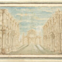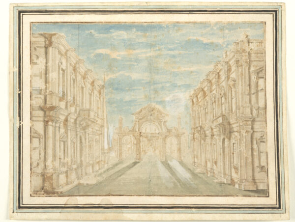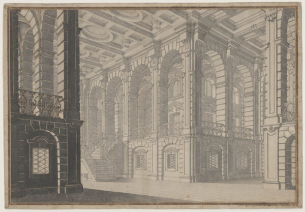 Bühnenbildentwurf einer lichtdurchfluteten Halle für das Theater in Bayreuth, von Carlo Galli Bibiena, entstanden 1745-1756. Deutsches Theatermuseum München, Inv. Nr. IV3447, ID 56607.