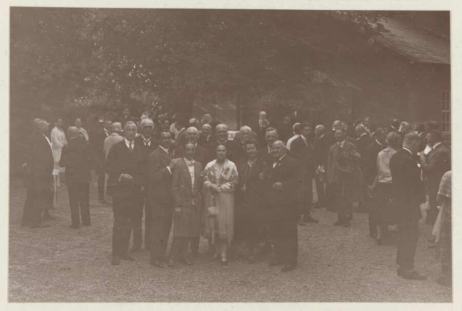 Gruppenfoto mit (von links nach rechts): Bildhauer Wirsing, Praesident Miller, Dr. Rapp, Frau Rapp, Geheimrat Förster, Frau Holl, Ministerialrat Daxenberger, Geheimrat Bulle, Frau Förster, Professor Holl, Geheimrat Halm, Theaterwissenschaftlichen Woche in Magdeburg, 1927. Foto: Carl und Lisa König. Deutsches Theatermuseum, ID 270463.