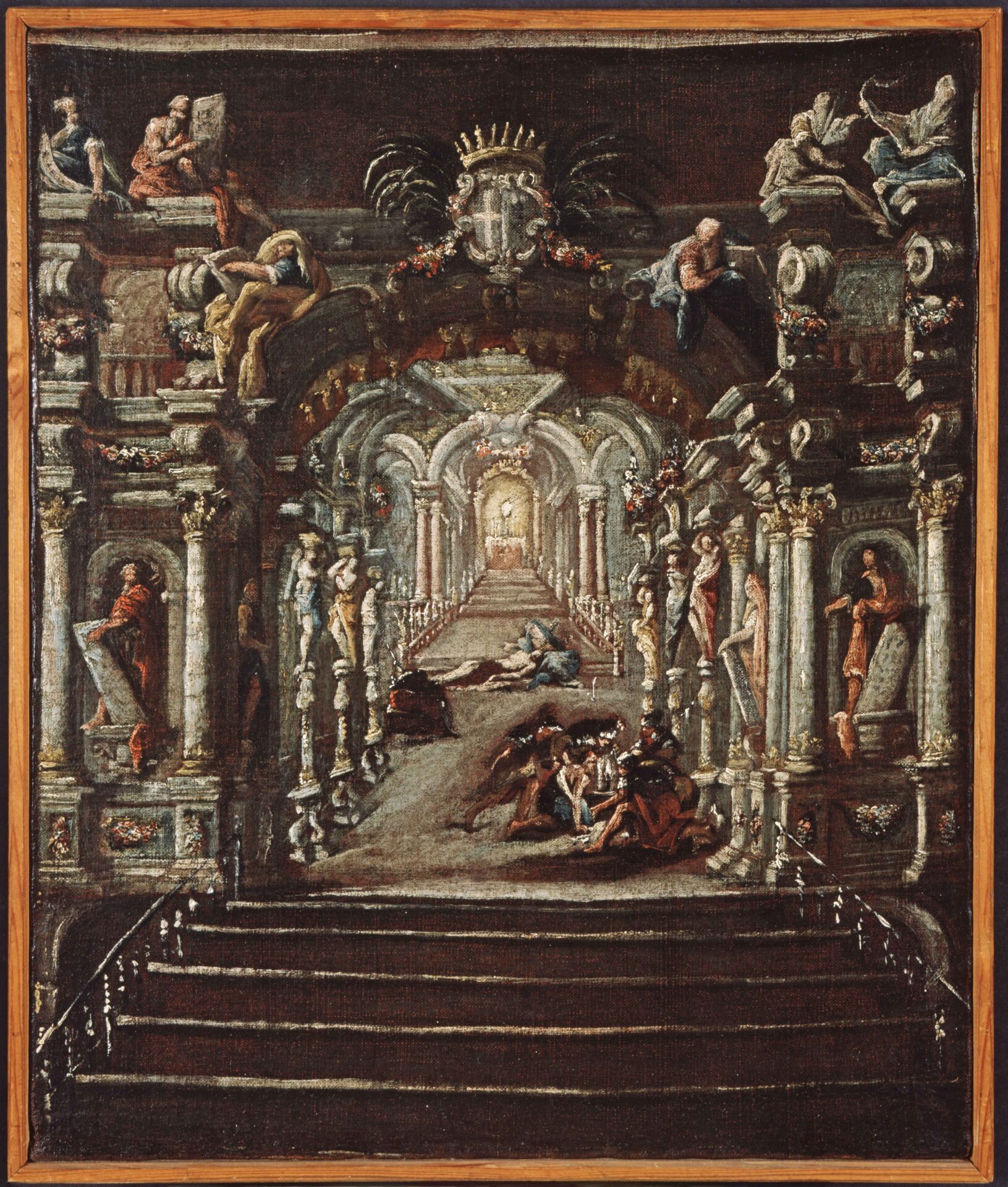 Das Gemälde zeigt das Aufführungsbild eines Passionsoratoriums. Architektonische Details lassen das von Domenico Mauro 1685 installierte Proszenium, den vorderen Bereich der Bühne, im Münchner Salvatortheater erkennen. Das Gemälde vereint die im Oratorium verhandelten szenischen Ereignisse in einem Bild. Sie sind in einer für das barocke Musiktheater typischen, perspektivisch gemalten Raumsituation, einer prächtigen dreischiffigen Halle angeordnet und zeigen Stationen der Leidensgeschichte Christi. Ob während des Oratoriums die szenischen Ereignisse nacheinander durch bewegtes Spiel ins Blickfeld rückten oder durch Auf- und Abtritte aufeinanderfolgten, bleibt ungeklärt.