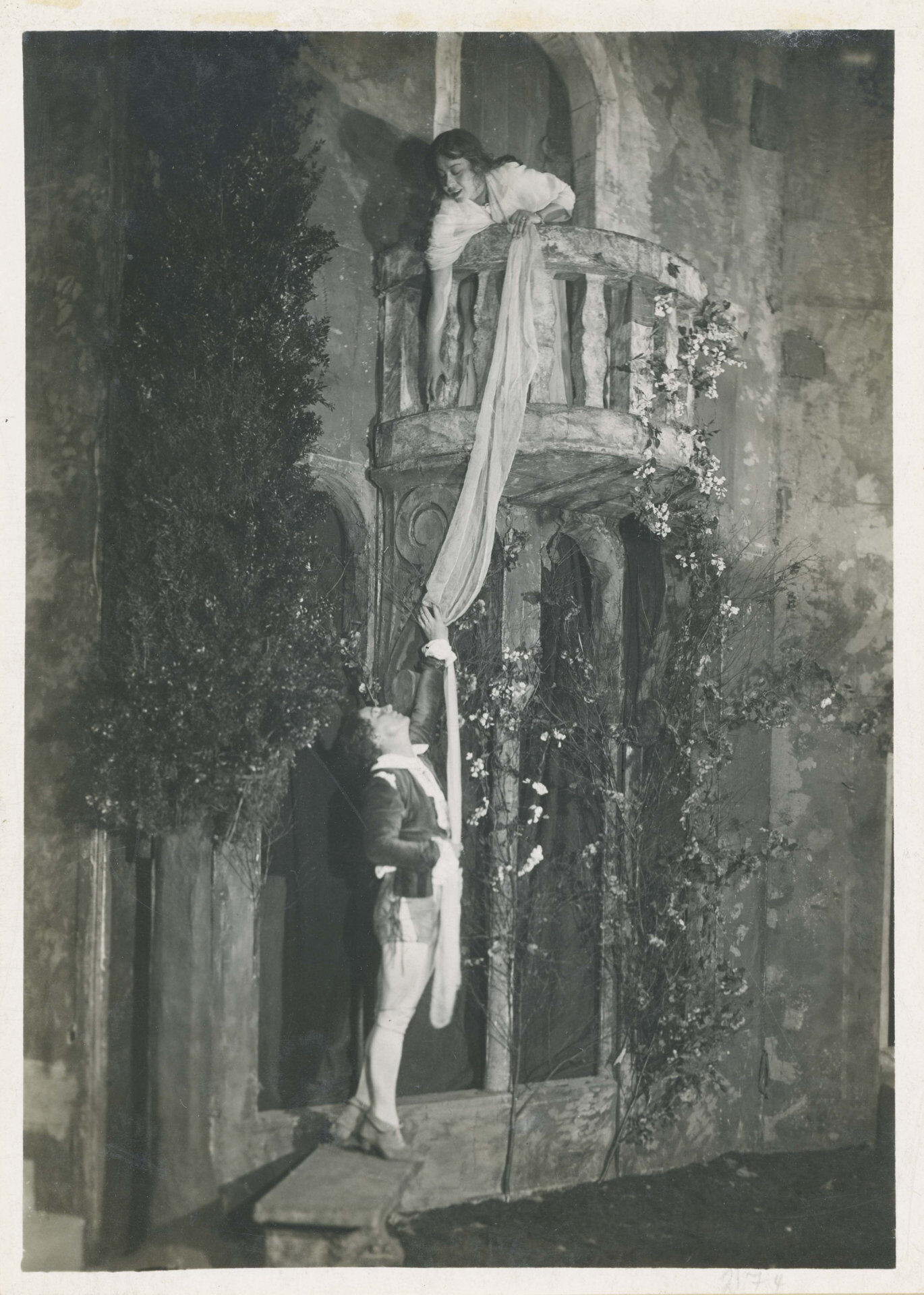 Die Einrichtung dieser Szene überlässt nichts der Vorstellungskraft des Zuschauers. Der Balkon im Stil der Renaissance samt Klettergewächsen, sowie die elisabethanischen Kostüme erinnern uns heute an Märchendarstellungen: „Rapunzel, lass Dein Haar herunter“, denkt man unwillkürlich – wenn es auch hier nur ein zarter Schal ist. Ein Schal, der zwar ungeeignet zum Hinaufklettern ist, der dann aber die beiden Liebenden umschlingen wird. Stofflich überwinden sie so die räumliche Trennung.