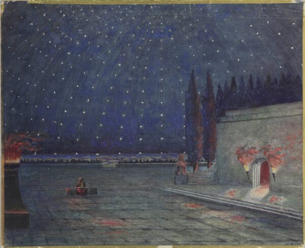 This narrative is visually emphasised primarily through stage design sketches, as the scenographic material is considerably more fruitful than the photographic documentation from the early decades of the 20th century – due to technical limitations. Extensive research brings together original graphics from collections in Cologne, Vienna, Berlin, Salzburg, Saarbrücken, and Munich.